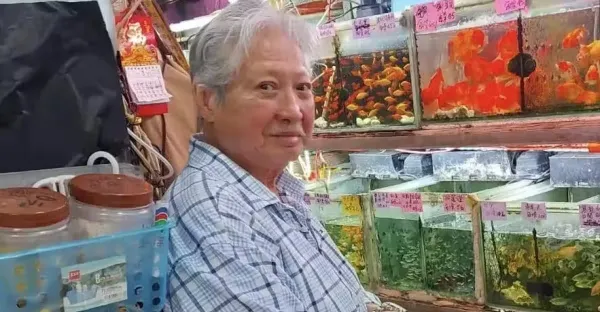 75歲洪金寶在香港,去一家店看金魚,穿著拖鞋出行,打扮不像明星