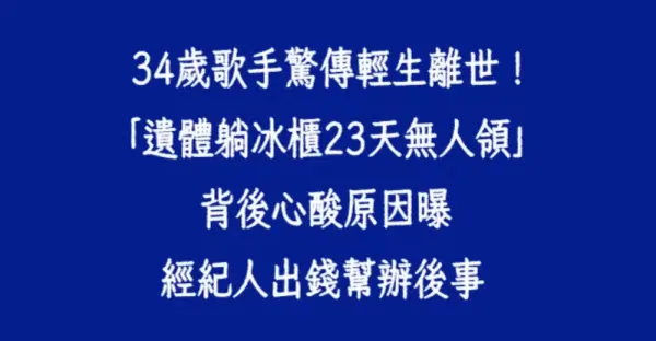 34歲歌手驚傳輕生離世!「遺體躺冰櫃23天無人領」背後心酸原因曝 經紀人出錢幫辦後事……