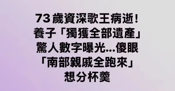 73歲資深歌王病逝!養子「獨獲全部遺產」驚人數字曝光...傻眼「南部親戚全跑來」想分杯羹!