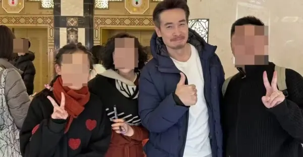 陳豪拿著行李耐心等太太陳茵媺買化妝品,遇見遊客求合影開心配合