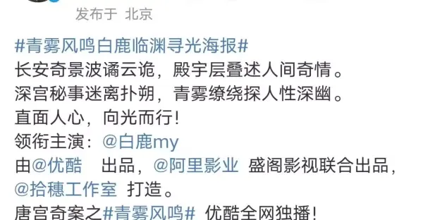 《唐宮奇案之青霧風鳴》官宣:,白鹿領銜主演一番女主!