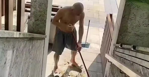 61歲江華穿拖鞋赤身掃地,身材健碩勝過同齡人,網友:挺像寺廟的住持