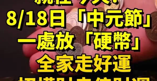 就在今天! 8/18日「中元節」一處放「硬幣」全家走好運,招橫財走偏財運!