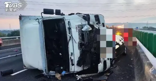 國一嚴重3車追撞車禍!大貨車「側翻卡3車道」 車頭全爛