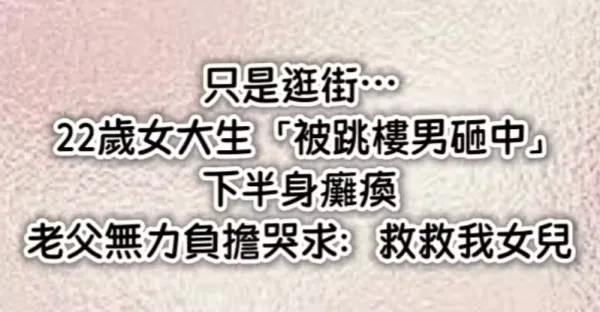 只是逛街…22歲女大生「被跳樓男砸中」下半身癱瘓 老父無力負擔哭求:救救我女兒