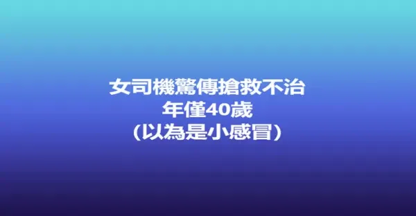 快訊 / 女司機驚傳搶救不治年僅40歲 (以為是小感冒)