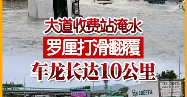 大道收費站淹水 羅厘打滑翻覆 車龍長達10公里