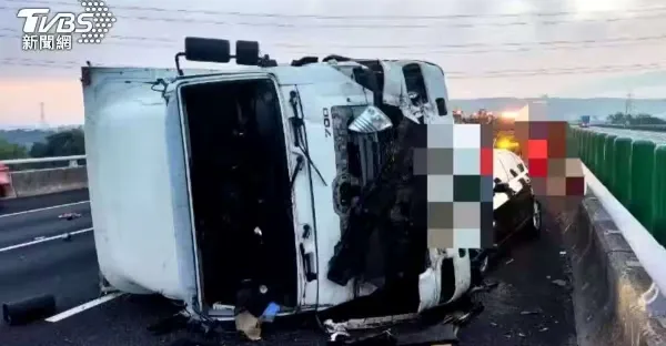國一嚴重3車追撞車禍!大貨車「側翻卡3車道」 車頭全爛!
