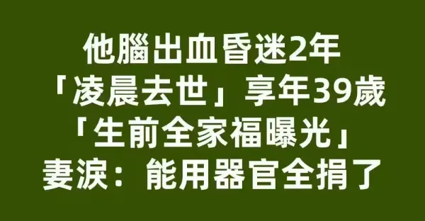 他腦出血昏迷2年「凌晨去世」享年39歲!「生前全家福曝光」妻淚:能用器官全捐了!