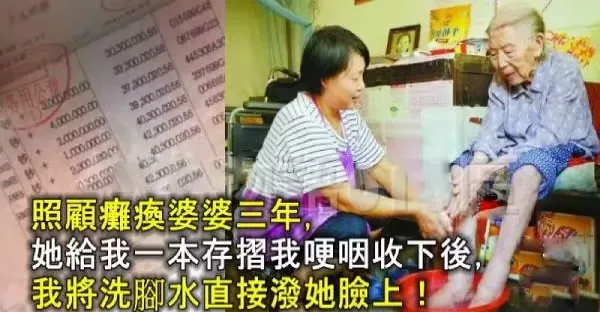 照顧癱瘓婆婆三年,她給我一本存摺我哽咽收下後,我將洗腳水直接潑她臉上!