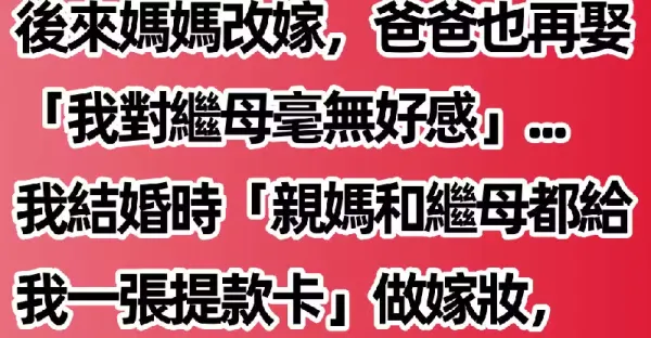我媽長得漂亮嫌棄我爸,我還很小他們就離婚了! 後來媽媽改嫁,爸爸也再娶「我對繼母毫無好感」...我結婚時「親媽和繼母都給我一張提款卡」做嫁妝,隔天我去ATM「一刷2張卡的金額」不敢相信......