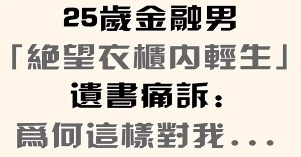 不顧父母反對!25歲金融男「入贅娶摯愛」才半年破滅 絕望「衣櫃內輕.生.亡」遺書痛訴:為何這樣對我...