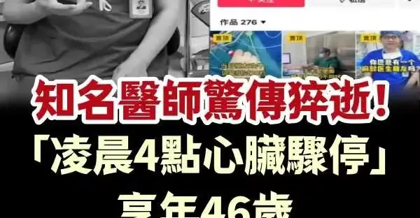 知名醫師 驚傳猝逝!「凌晨4點心臟驟停」享年46歲 知情人曝「生前不對勁」:作息讓人心疼