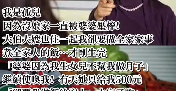 我是孤兒,因為沒娘家一直被婆婆壓榨!大伯大嫂也住一起我卻要做全家家事、煮全家人的飯…才剛生完「婆婆因為我生女兒不幫我做月子」繼續使喚我! 有天她只給我500元「卻要我做飯給客人一大家子吃」,我收下後「淡定端出10幾道菜」婆婆馬上臉色大變~