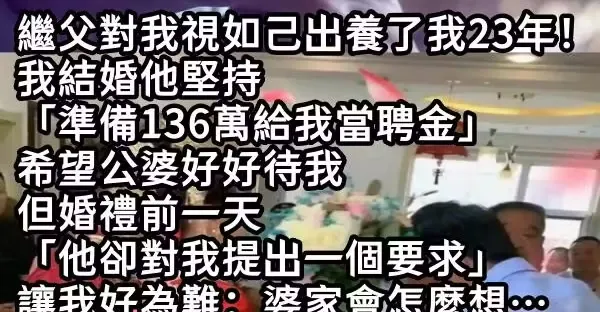 繼父對我視如己出養了我23年! 我結婚他堅持「準備136萬給我當聘金」希望公婆好好待我,但婚禮前一天「他卻對我提出一個要求」讓我好為難:婆家會怎麼想~😔