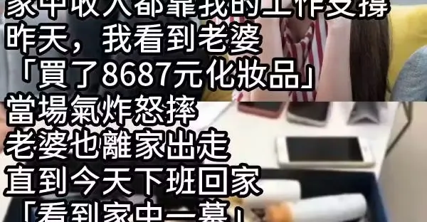 和老婆結婚後,家中收入都靠我的工作支撐。昨天,我看到老婆「買了8687元化妝品」,當場氣炸怒摔,老婆也離家出走。直到今天下班回家「看到家中一幕」,我內疚地向老婆道歉…