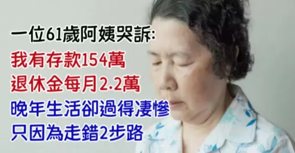 一位61歲阿姨哭訴:我有存款154萬...退休金每月2.2萬,晚年生活卻過得悽慘,只因為走錯2步路...