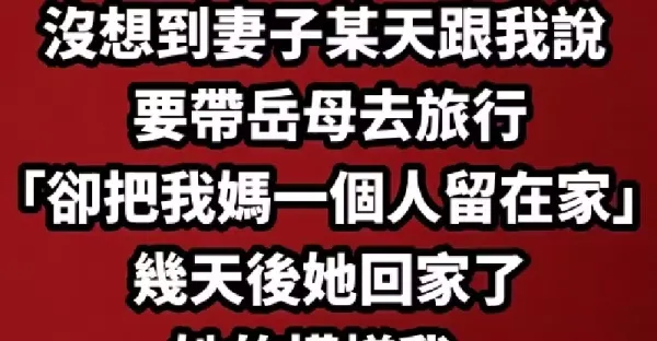 我和老婆婚後AA制已經5年,沒想到妻子某天跟我說,要帶岳母去旅行「卻把我媽一個人留在家...」,幾天後她回家了,她的模樣我卻陌生到認不出來…