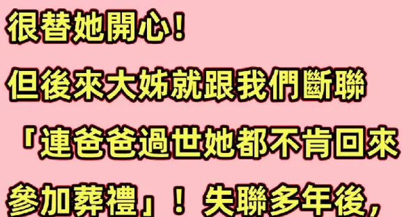 大姐遠嫁給有錢人,我去過她家一次看見房子很豪華,很替她開心! 但後來大姐就跟我們斷聯「連爸爸過世她都不肯回來參加葬禮」!失聯多年後…大姐過世時我去看外甥女「才發現她的真實目的」…