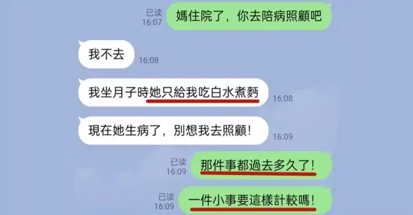 月子期間我媽只給老婆吃白水煮麵,現在我媽住院老婆拒絕照顧,一家人真的要那樣計較嗎?坐月子的一點小事都要記這麼久?