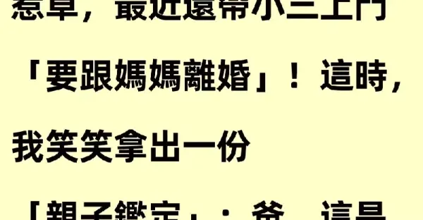 我爸很花心,多年來捻花惹草,最近還帶小三上門「要跟媽媽離婚...」這時,我笑笑「拿出一份親子鑑定」:爸,這是送你的離婚禮物...