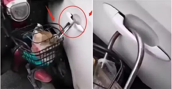 車主亂停車堵住出口,「熱心阿嫲」放大招報復!回來一看車門上掛著一輛電動車, 差點跪下!