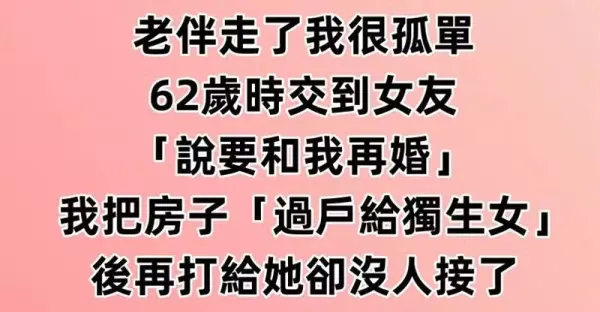 我62歲找到第二春! 再婚前一天「我先把房子過戶給獨生女」,隔天打給女友「找她去登記結婚」打了5通都沒人接~