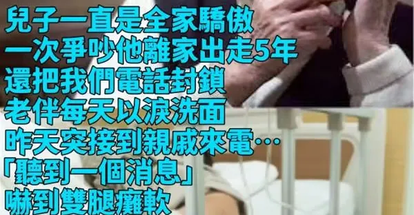 兒子一直是全家驕傲,一次爭吵他離家出走5年,還把我們電話封鎖,老伴每天以淚洗面,昨天突接到親戚來電…「聽到一個消息」嚇到雙腿癱軟
