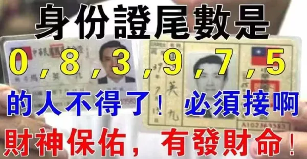 身份證尾數是「0 8 9 3 7 5」其中一個數字的人不得了「財神保佑」有發財運,